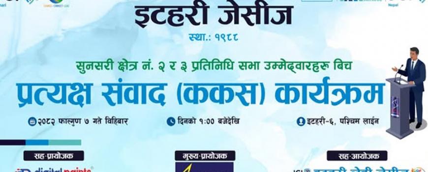 इटहरी : इटहरी जेसिजले बिहीबार प्रतिनिधिसभा उम्मेदवारसँग प्रश्नोत्तर कार्यक्रम (ककस) गर्ने भएको छ । सुनसरी क्षेत्र नम्बर २ र ३ का प्रतिन