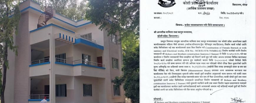 इटहरी : नेपाल प्रहरीको भवन निर्माणको जिम्मा पाएका निर्माण व्यवसायी भुक्तानी नपाएर समस्यामा परेका छन् । कोशी प्रदेश प्रहरी कार्यालय विरा