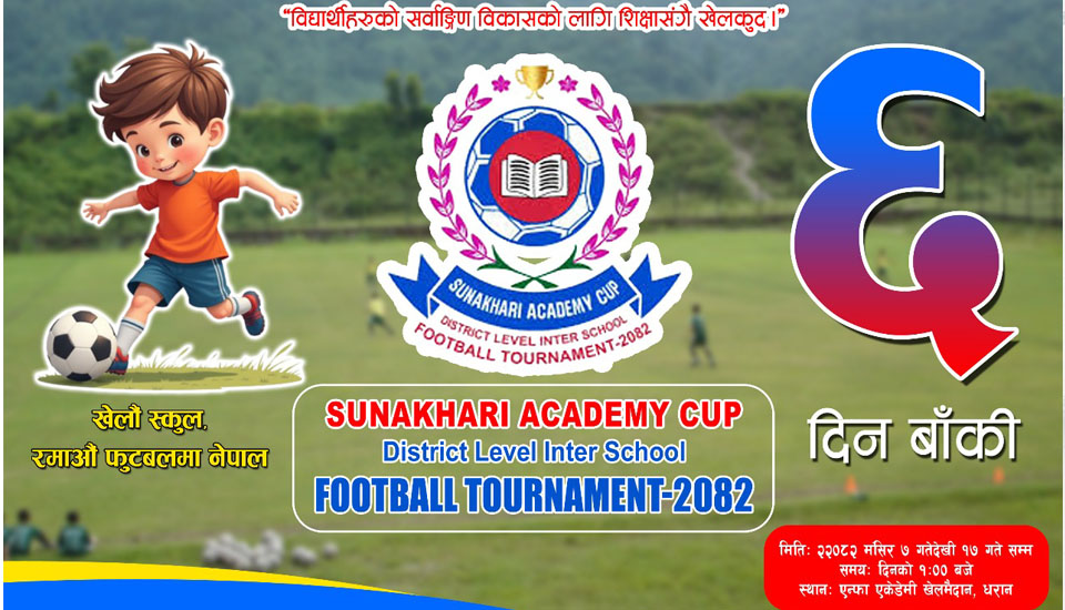 धरान: धरानमा सुनसरी जिल्ला स्तरीय‘सुनाखरी एकेडेमी कप’ अन्तर विद्यालय फुटबल प्रतियोगिता हुने भएको छ । मङ्सिर ७ देखि १७ गतेसम्म सञ्चालन ह