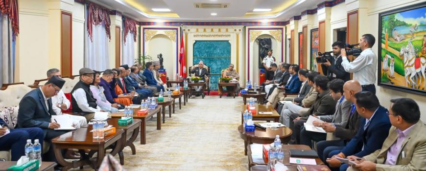 धरान : राष्ट्रपति भवन शिलत निवासमा आज शुक्रवार भएको सर्वदलीय बैठकका सहभागी राजनीतिक दलहरूलाई राष्ट्रपति रामचन्द्र पौडेलले देश, जनता, लो