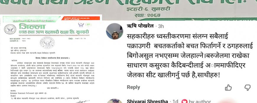 इटहरी : जिल्ला बचत तथा ऋण सहकारी सङ्घ सुनसरीका पूर्व अध्यक्ष शिवराज श्रेष्ठ र सचिव प्रलाद दाहाललाई स्पष्टीकरण सोधेपछि खैलाबैला मच्चिएको