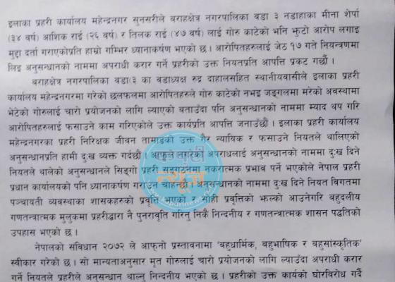 सुनसरी:इलाका प्रहरी कार्यालय महेन्द्रनगर सुनसरीले झुठा मुद्दामा निर्दोषलाई फसाउन लागेको भन्दै साँस्कृतिक अधिकार संरक्षण समितिले विरोध ज