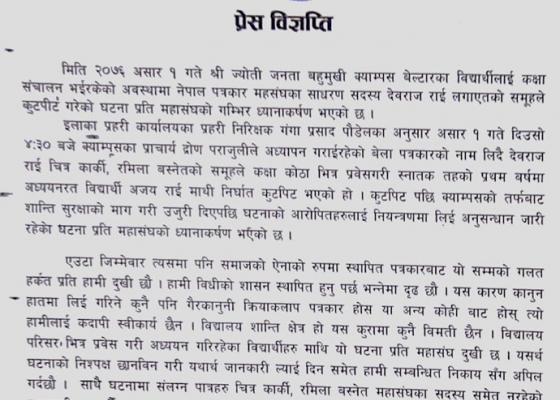 उदयपुरः पढाई भइरहेको बेला आइतबार क्याम्पसमा कक्षा कोठाभित्रै विद्यार्थीलाई कुटपिट गरेको आरोपमा उदयपुर जिल्लामा पत्रकारसहित ४ जना पक्राउ