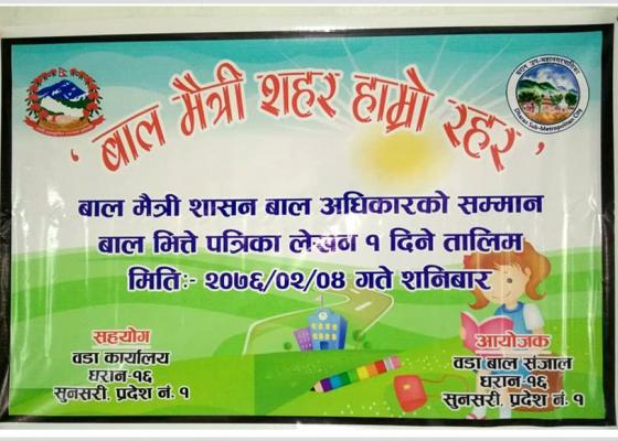 धरान : धरान उपमहानगरपालिका वार्ड नंं.१६ को आयोजनामा १ दिने बाल भित्ते पत्रिका तालिम सम्पन्न भएको छ । शनिबार सम्पन्न तालिममा वडामा रहेक